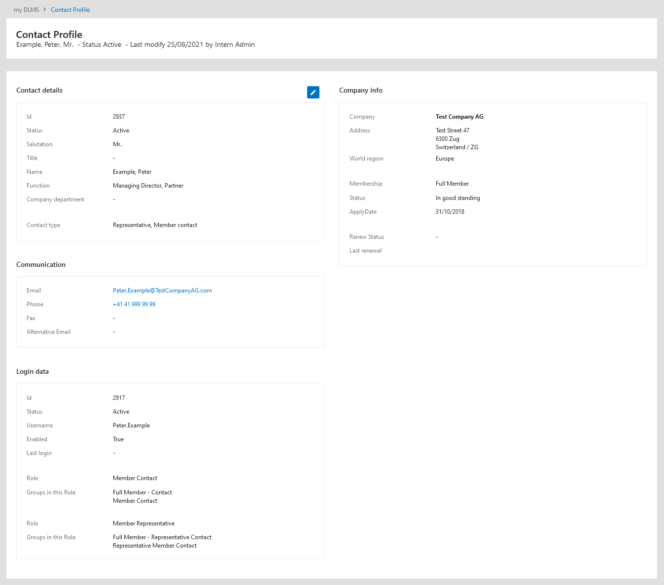 - Editable fields are identified by a pencil symbol in the upper right-hand corner of the section.